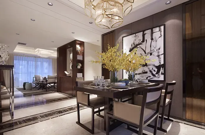 这张简中风格装修效果图向大家展示了餐厅的背景墙,这是一幅抽象画,周边用低调内敛的木制框包围,从而同整体的家具色彩相辉映。
